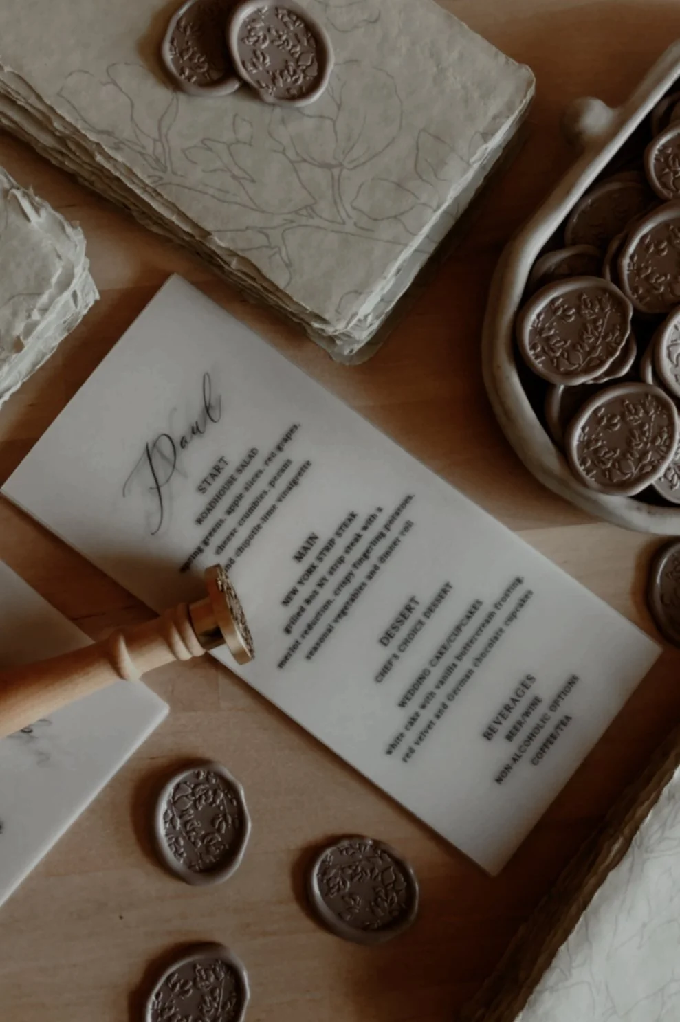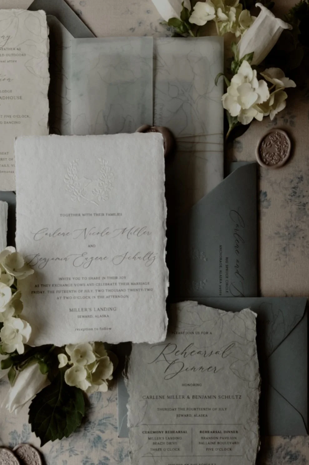 We love sourcing and including the highest quality details: foil and letterpress printing, vellum overlays and wraps, belly bands, fine paper twine and silk ribbon, hand-poured wax seals, envelope liners, vintage postage, gold leaf edging, embossed borders, hand painted details, venue illustrations, custom maps and so much more! If you have an idea for something you’d like included, but aren’t sure if it is possible, send us a message with your inquiry!