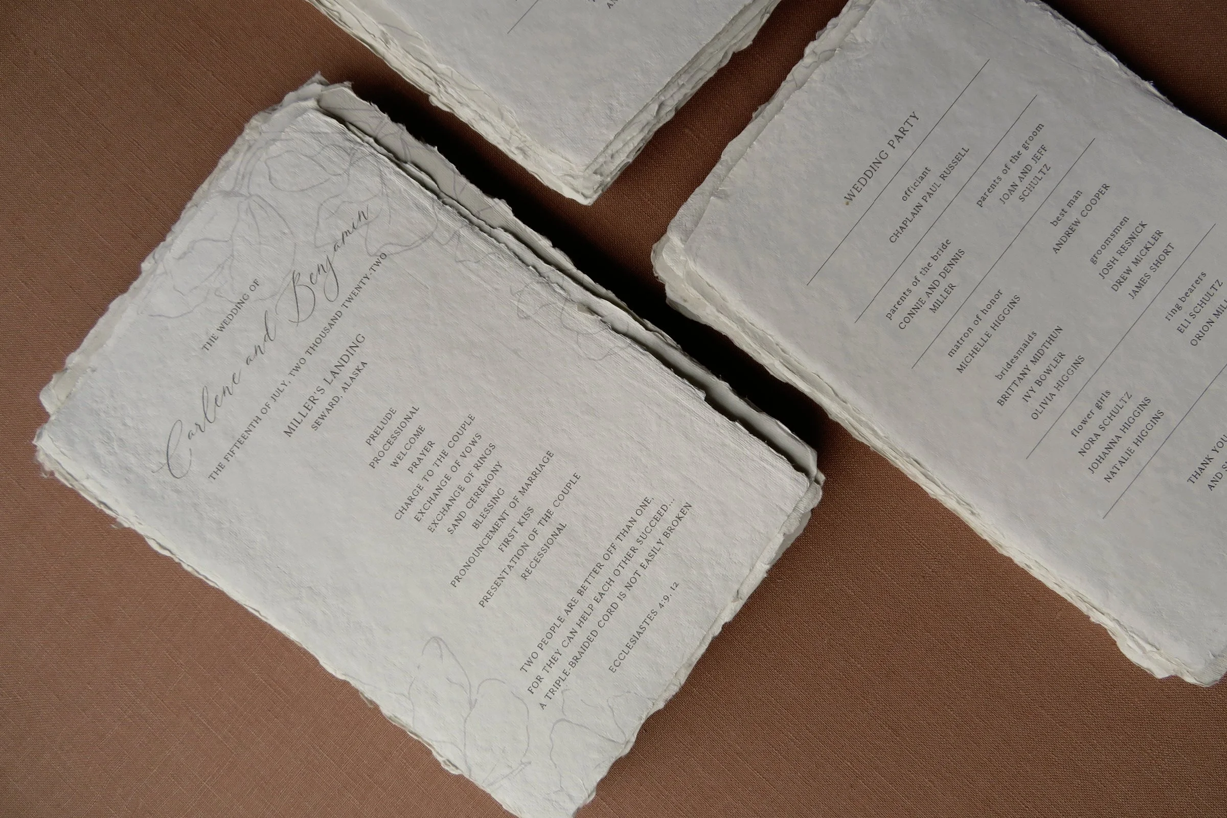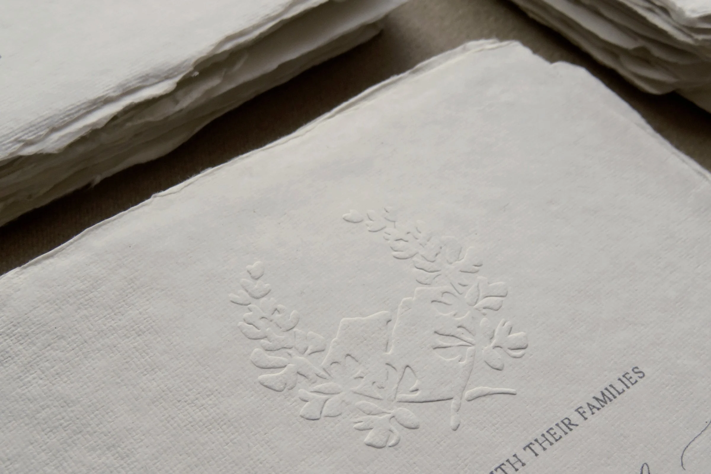 We LOVE working with handmade paper, cotton cardstock, and vellum. But feel free to inquire if you have other paper/mediums in mind. We are happy to discuss options; for example, blind deboss or foil on velvet!