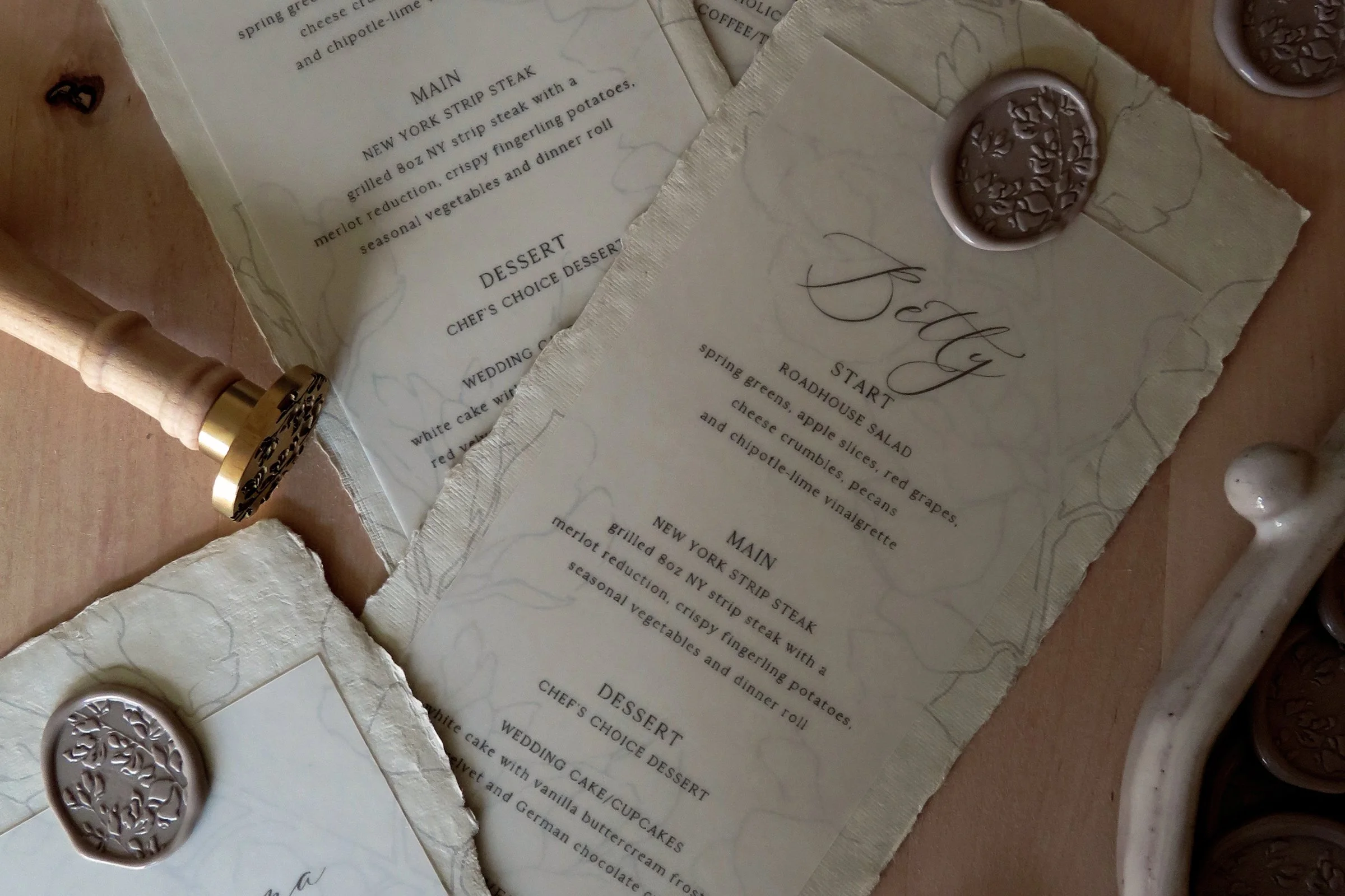 Very! We pride ourselves in the experience we create and the customizable options we provide for our couples. While maintaining the overall structure and integrity of a semi-custom design, our couples are not restricted to a selection of paper and colors to choose from. We love working with our couples to select the details and embellishments that will best complete their aesthetic and vision. We work with couples to select the perfect envelope liner and wax seal, for example, or illustrate their venue to use throughout the suite.
